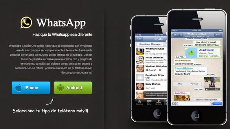 La estafa de la que ya han alertado la Policía y la Guardia Civil ( enlace de Facebook de la Policía Nacional ) los estafadores, animan a la gente a descargarse esta versión mejorada la que cuesta 36 euros al mes. Con este atractivo nombre y utilizando la famosa aplicación WhatsApp se disfraza este nuevo fraude, un timo que le llega al usuario a través de las redes sociales, en forma de invitación para actualizar su versión de WhatsApp, y del que ya han alertado tanto la Guardia Civil en twitter como la Policia Nacional en twitter. La broma o trama del WhatsApp Edición Oro, es un servicio que en realidad no existe, le cuesta al usuario nada más y nada menos que 36 euros al mes. Aparece en Facebook y Twitter bajo la sugerente leyenda de conseguir un WhatsApp diferente y exclusivo.